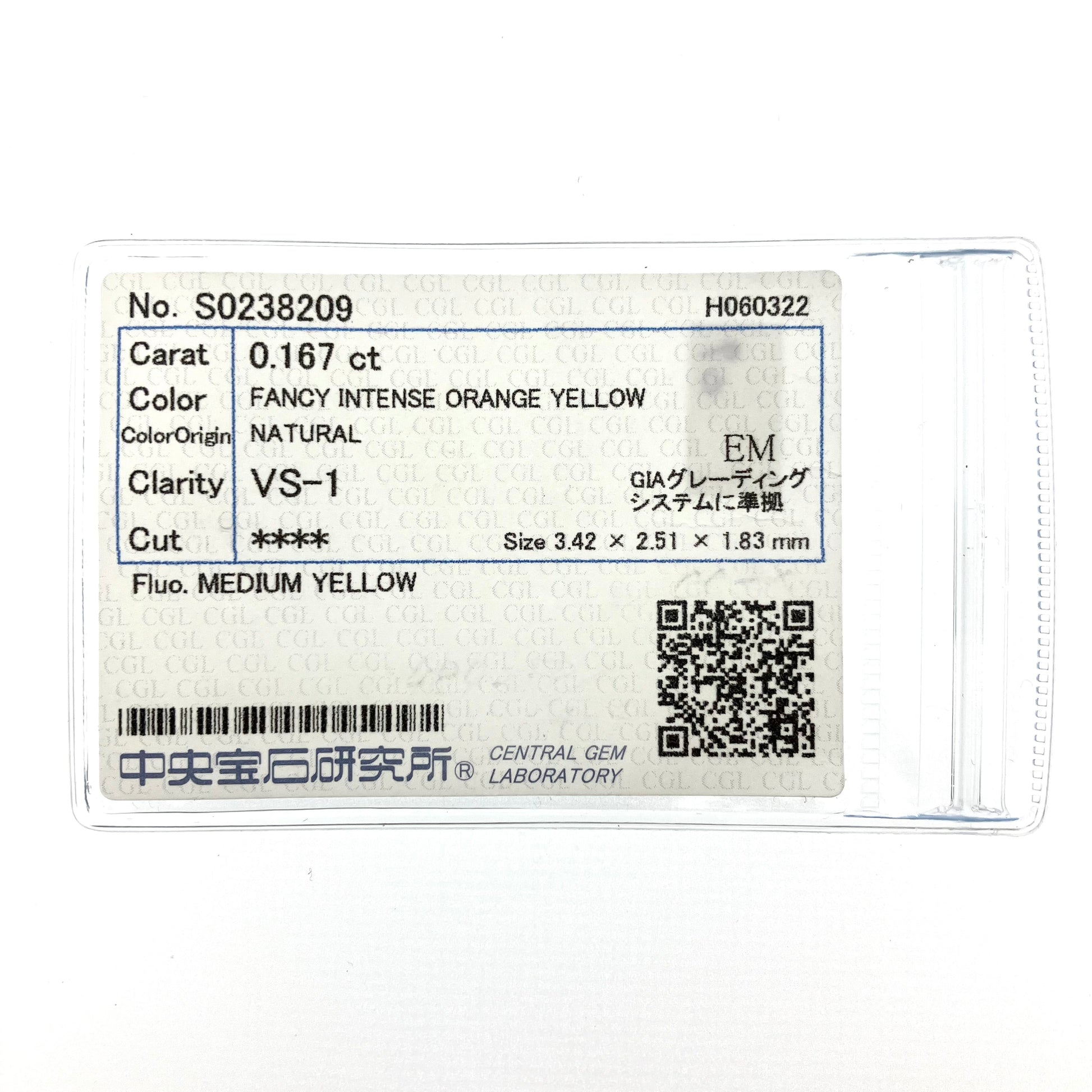 裸石 0.167ct Fancy Intense Orange Yellow VS-1 EM 中央宝石研究所ソーティング付き