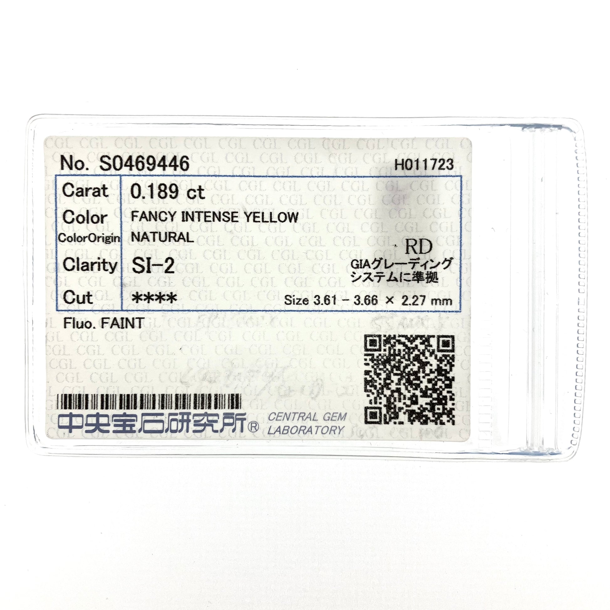裸石 0.189ct Fancy Intense Yellow SI-2 RD 中央宝石研究所ソーティング付き