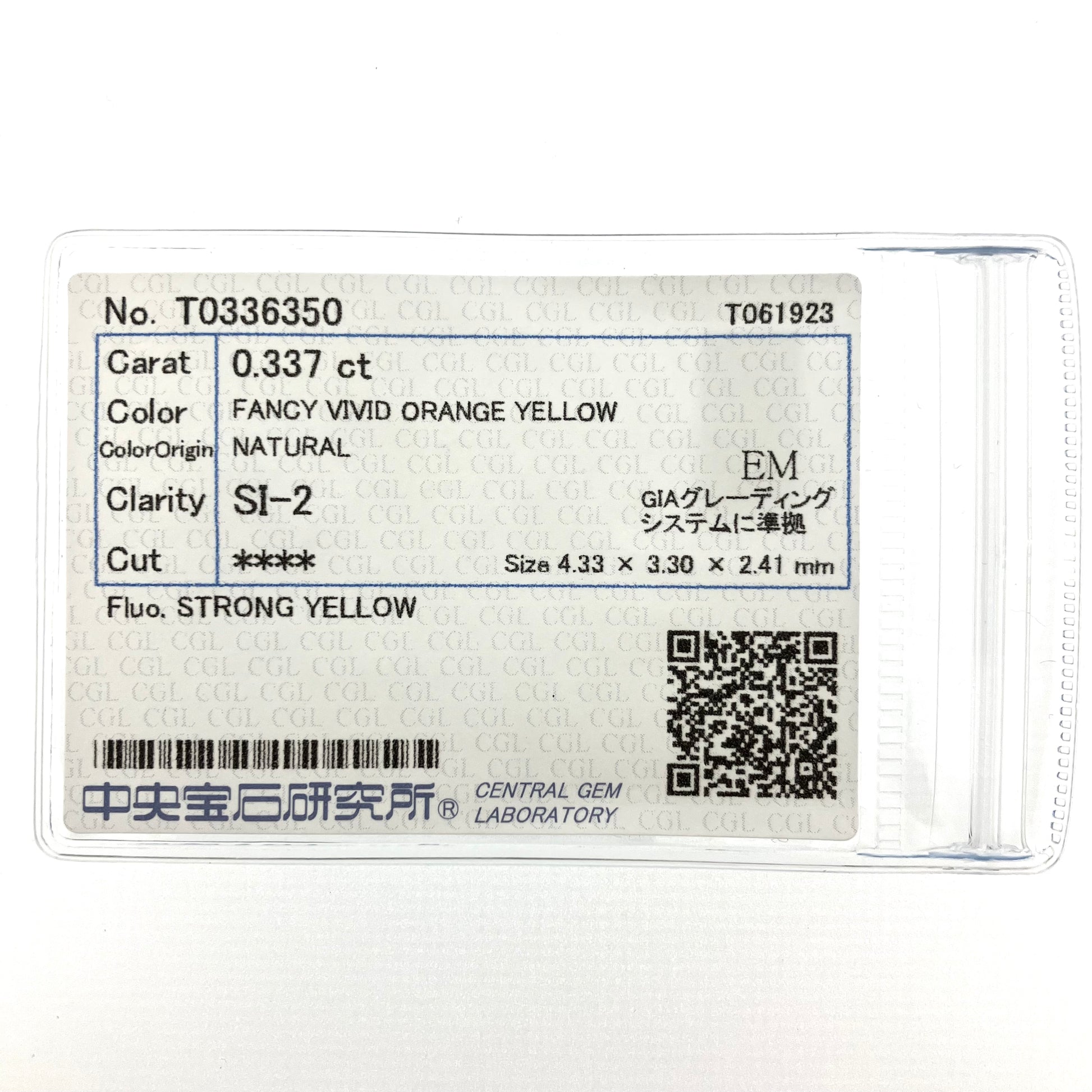 裸石 0.337ct Fancy Vivid Orange Yellow SI-2 中央宝石研究所ソーティング付