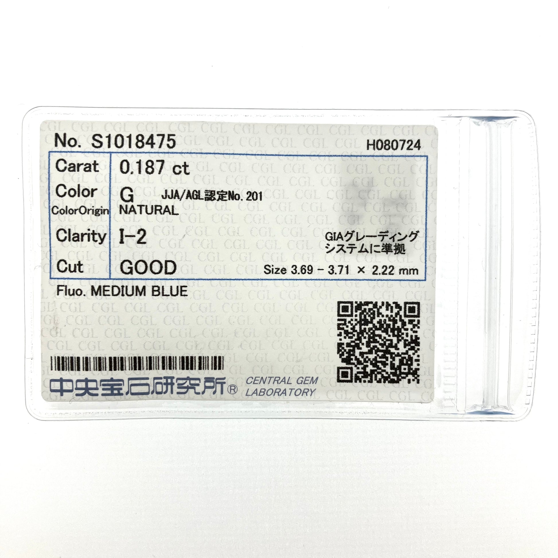 裸石 0.187ct Gカラー I-2 中央宝石研究所ソーティング付